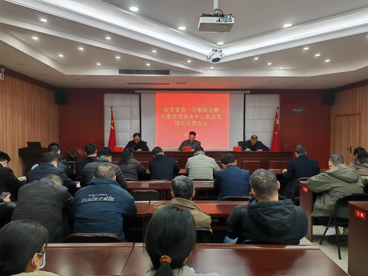 2025年12月4日下午,校党委第一巡察组向后勤管理服务中心党总支反馈巡察情况,校党委第一巡察组工作人员、后勤管理服务中心领导班子及全体教职工参会,会议由后勤管理服务中心党总支书记、后勤处处长、后勤管理服务中心主任何燚主持。